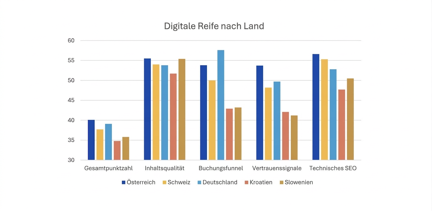 Österreich ist der ausgewogenste Markt — niedrigste OTA-Abhängigkeit (22,3 %), höchster Direktbuchungs-Score (12,8 %), stärkstes DMO-Ökosystem (Austria.info und Wien.info erreichen 10,3 % Zitierungsrate). Österreichische Unterkünfte erzielen auch die höchsten Vertrauenssignal-Werte.
