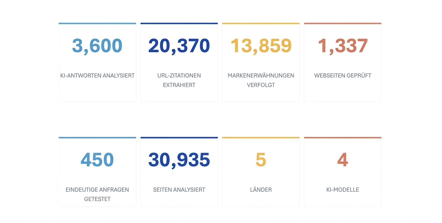 450 Anfragen aus dem Gastgewerbe, getestet an vier KI-Modellen (GPT-5, Gemini 2.5, Perplexity und Mistral). Ergebnis: 3.600 KI-Antworten mit 20.370 URL-Zitierungen und 13.859 Markenerwähnungen.