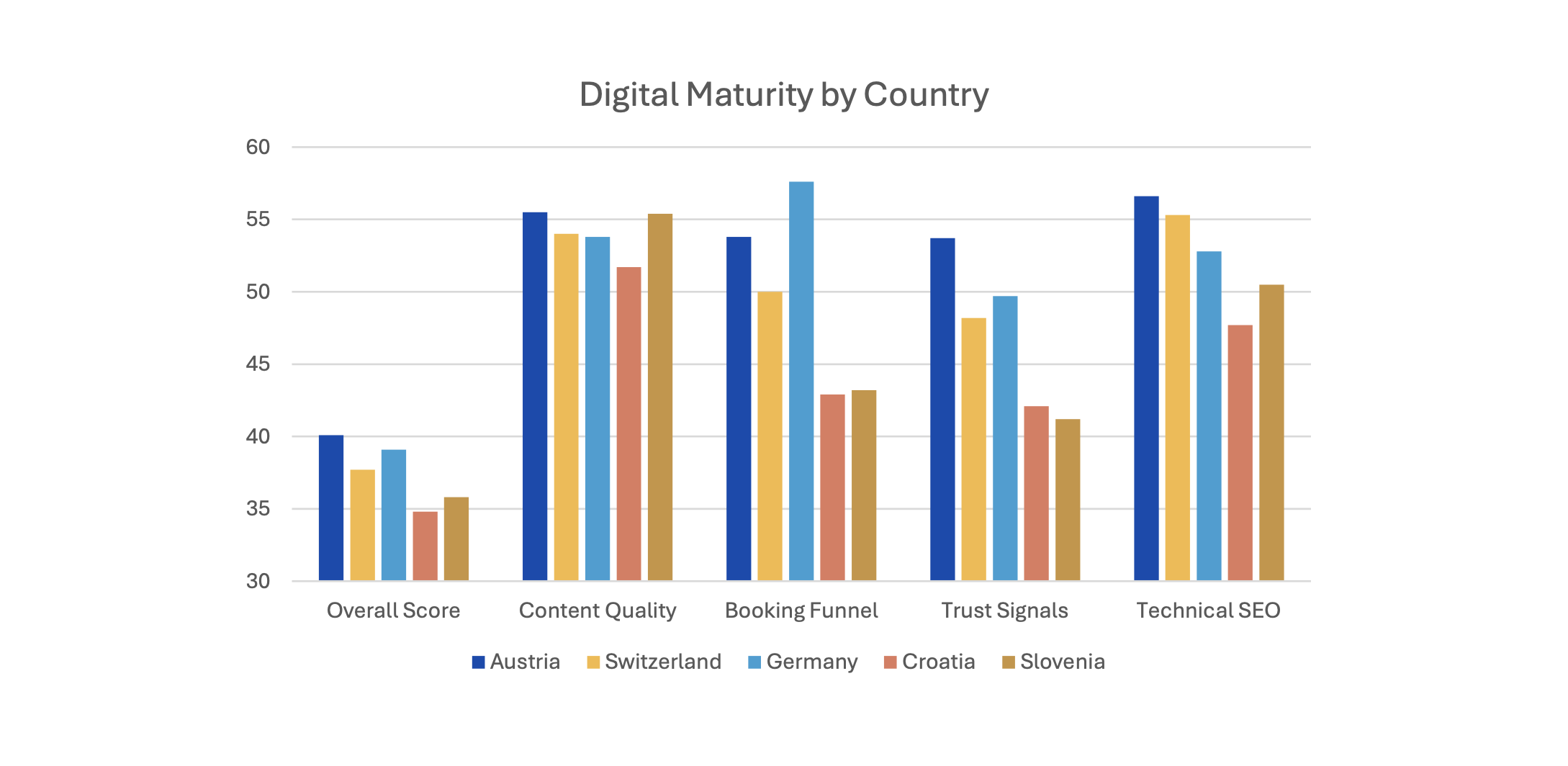 Austria is the most balanced market — lowest OTA dependency (22.3%), highest direct booking score (12.8%), strongest DMO ecosystem (Austria.info and Wien.info achieve 10.3% citation rates). Austrian properties also score highest on trust signals.